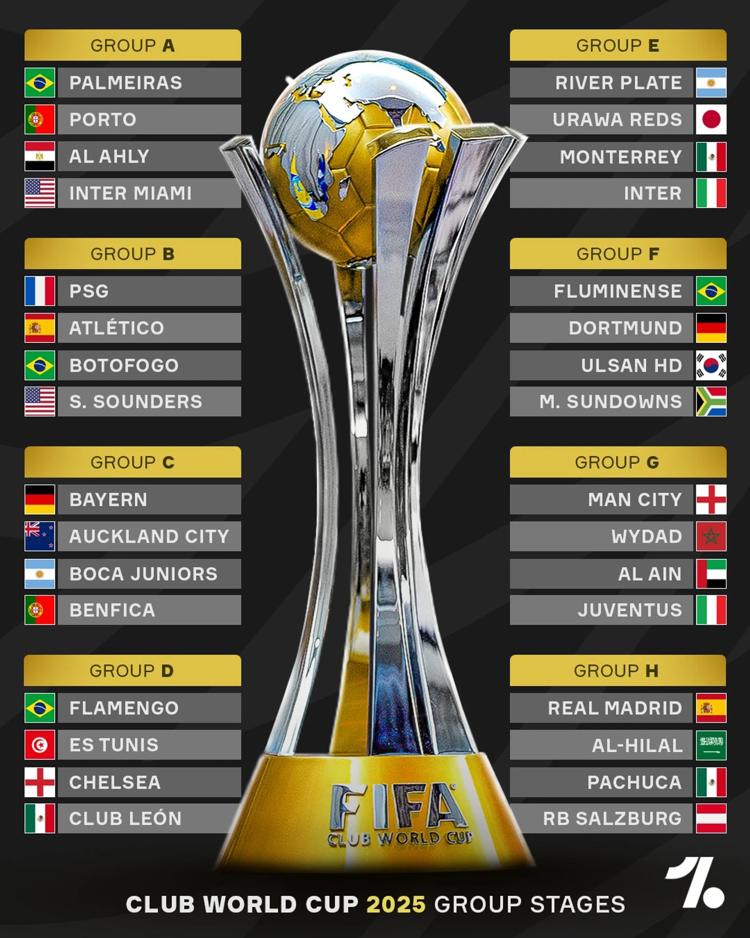 В Майами прошла жеребьевка группового этапа клубного чемпионата мира, турнир пройдет в США с 15 июня по 13 июля 2025 года.