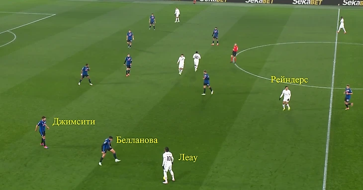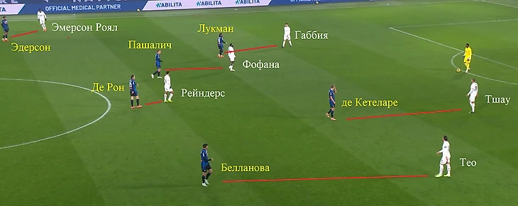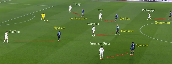 И вот дальше ключевая и интересная опция, которая не применялась ранее в матчах с такой схемой. Огромный перегруз левого фланга атаки «Аталанты». Судя по всему, Гасперини резонно предположил, что фланг с Мусой, Эмерсоном и Пулишичем с точки зрения обороны слабее, чем тройка Рейндерс, Тео и Тшау. В итоге в эту зону постоянно подключались помимо постоянных жильцов (Лукман и Руджери) еще и Колашинац с Эдерсоном.