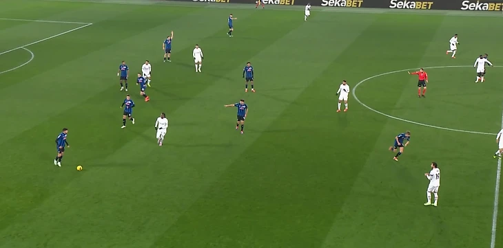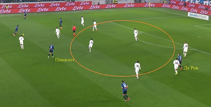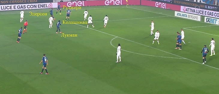 «Аталанта» свои атаки начинала без спешки. Сначала четко брали мяч под контроль, потом расставлялись и начинали искать бреши в обороне гостей. Контратак и быстрых отрывов практически не было. В том числе и потому, что все игроки участвовали в оборонительных действиях, когда таковые происходили на половине поля хозяев (см. скрин ниже).