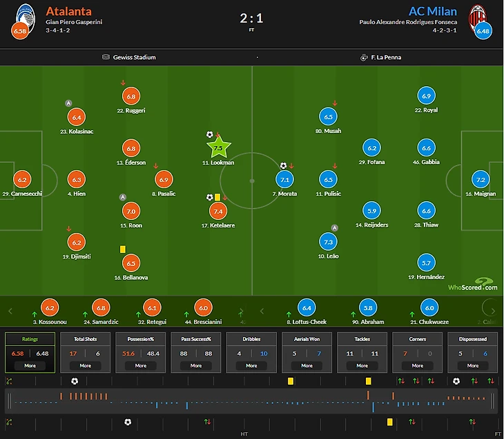 И «Милан» ничего с этим не смог поделать. Всего лишь 6 ударов и 0,9 по xG по данным understat. Задачу для Фонсеки усложнила еще и травма Кристиана Пулишича на 38 минуте. Лишнее свидетельство огромный перекос показателя PPDA (passes allowed per defensive action in the opposition half - передачи, допущенные на каждое оборонительное действие на половине поля соперника) по данным understat 13,58 у «Аталанты» и 26,78 у «Милана». Проще говоря, у кого показатель меньше, тот более интенсивно прессингует и мешает сопернику начинать атаки.