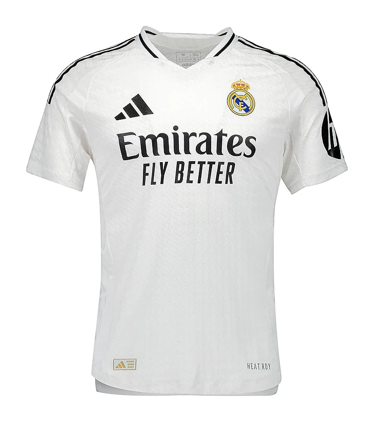 Домашний комплект неизменно представлен в белом цвете, что подчёркивает статус «Реала» как клуба с богатейшей историей и традициями. В этом сезоне белый фон дополняется тонкими золотыми акцентами на манжетах и воротнике, символизируя чемпионские амбиции.