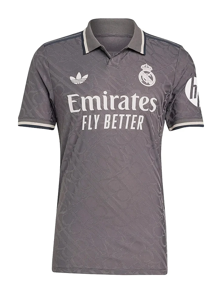 Третий комплект, созданный специально для европейских матчей, выделяется своим глубоким синим цветом. Абстрактный узор на ткани напоминает волны, символизируя связь с культурным наследием Мадрида. Серебристые акценты на логотипах и воротнике делают форму особенно стильной и узнаваемой.