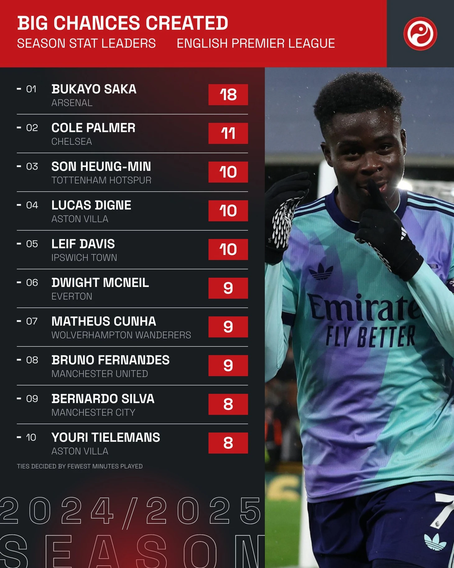 🔥 Кто создал наибольшее количество моментов в этом сезоне АПЛ? На первом месте игрок «Арсенала»