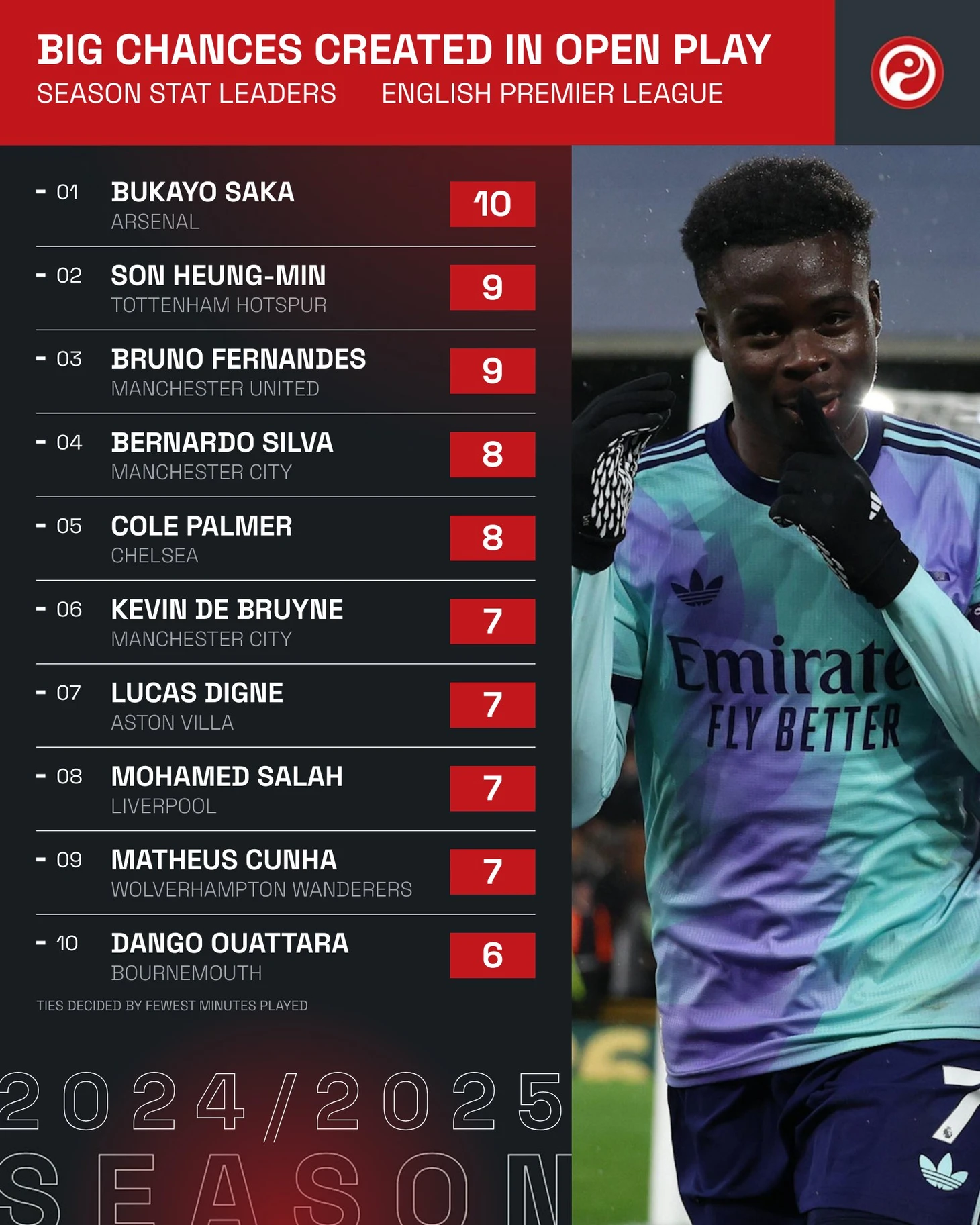 В текущем розыгрыше АПЛ «Арсенал» – король угловых, но и по моментам, созданным с игры, в общем рейтинге чемпионата лидирует Сака: без учета стандартов у Букайо будет 10 голевых эпизодов.