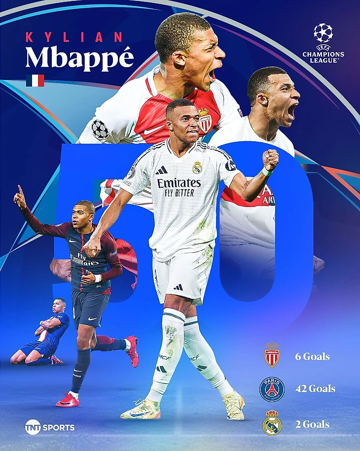 🤯 Мбаппе забил 50-й гол в ЛЧ! Лишь один игрок был моложе Килиана, когда оформил полсотни мячей в турнире