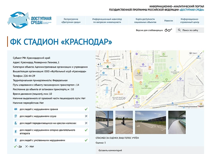 На сайте «Доступная среда» стадион ФК «Краснодар» отмечен как недоступный для людей, передвигающихся на креслах-колясках