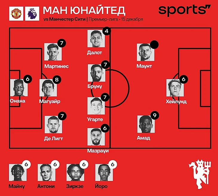 Лисандро Мартинес (7) – спокойная и уверенная игра, его флангом «Сити» почти не атаковал. Потрясающий ассист на победный гол Амада.