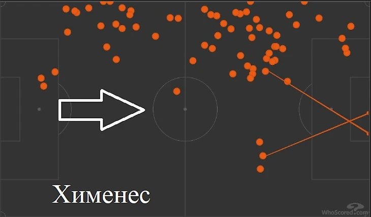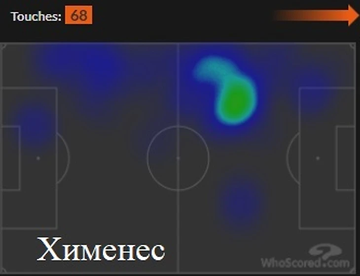 52 передачи (24 - вперёд, 28 - назад), 45 точных - 86,5%. 2 дальних удара, один из которых вполне мог обернуться голом, благодаря рикошету. Ниже карта касаний и тепловая карта Хименеса.
