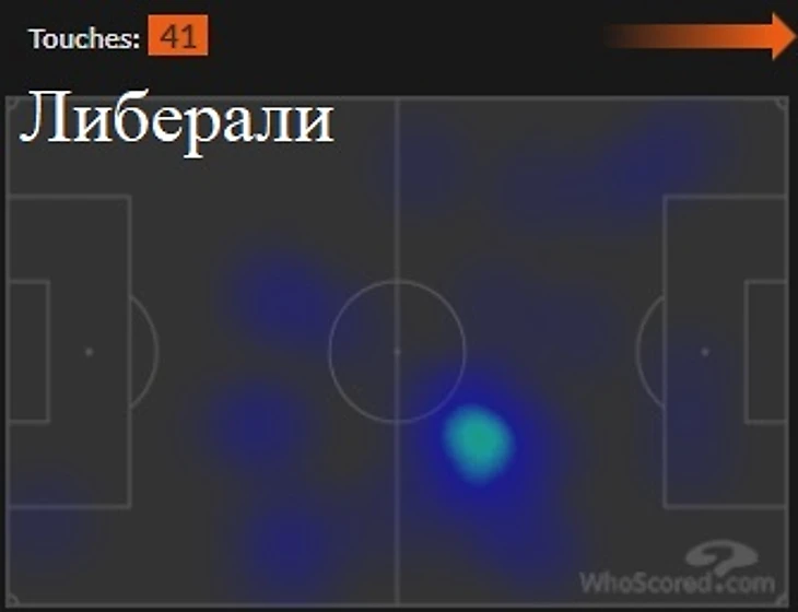 Отдал 31 передачу (17 вперёд и 14 назад), 24 из них точные - 77,4%. Нанёс 2 удара. Первый из-за штрафной с подбора после углового - в касание и сильно не точно. Второй, выиграв верховую дуэль (при своих-то габаритах - около 170см рост), тоже мимо цели. Ниже карта касаний и тепловая карта.