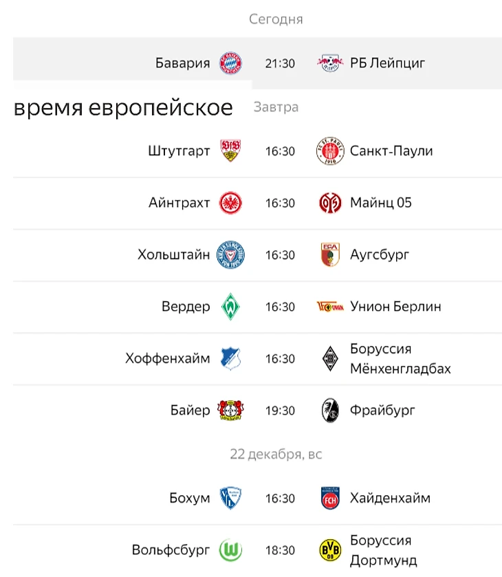 Открывает тур супер-матч на «Альянц Арене», где уже сегодня «Бавария» примет «Лейпциг». Мюнхенцы заканчивают год на первом месте с отрывом в 4 очка от «Байера». Но дабы укрепить своё преимущество и сделать подарок болельщикам перед Рождеством, нужно обыгрывать «РБ», и уверенно уходить в новый календарный год.