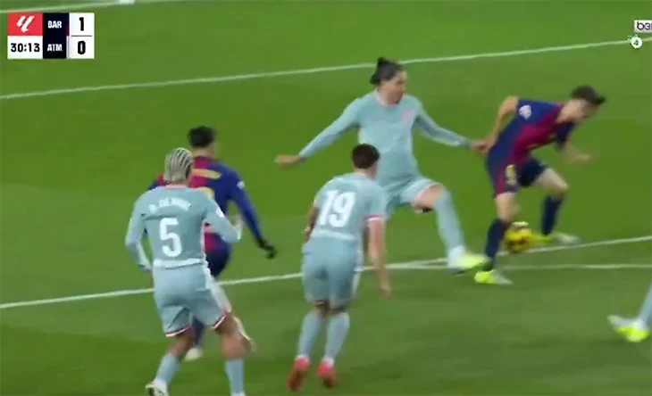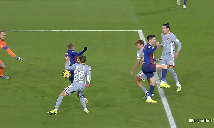 Однако именно каталонцы начали намного активнее. На 20-й минуте – первый спорный момент: мяч попал в руку Джулиано Симеоне, сыну тренера «Атлетико». Главный судья Рикардо Бенгоэчеа не назначил пенальти. После совещания с ВАР пришел к выводу, что действие было неумышленным.
