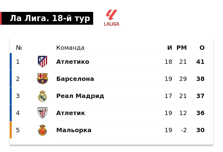 Теперь команда Симеоне идет первой с 41 очком – плюс матч в запасе, который есть и у «Реала», но нет у каталонцев. Его отыграют в январе.