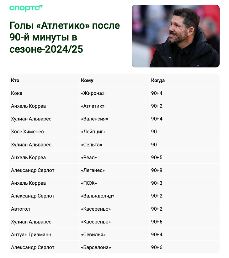 13 голов «Атлетико» после 90-й минуты – убийственная фишка Симеоне