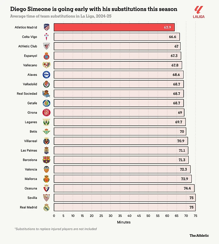Еще Симеоне раньше всех в Испании вносит изменения – в среднем на 64-й минуте. Дольше всех это делает «Реал», ведь Карло Анчелотти часто выпускает несколько новых игроков на 80-й минуте, а до совершает максимум одну-две замены.