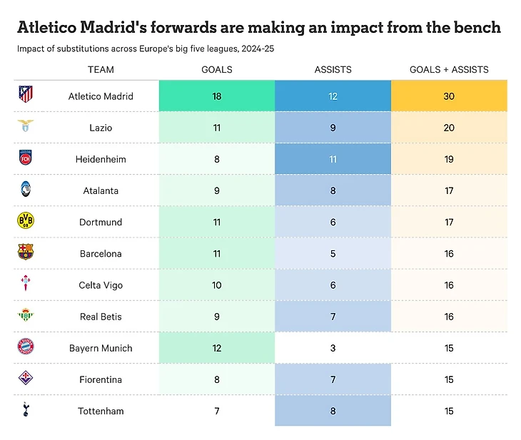Перед матчем с «Барсой» вышло исследование The Atlethic, там тоже восторгаются эффективностью замен Симеоне. Игроки «Атлетико», которых выпускает тренер, чаще остальных в топ-лигах приносят результат.