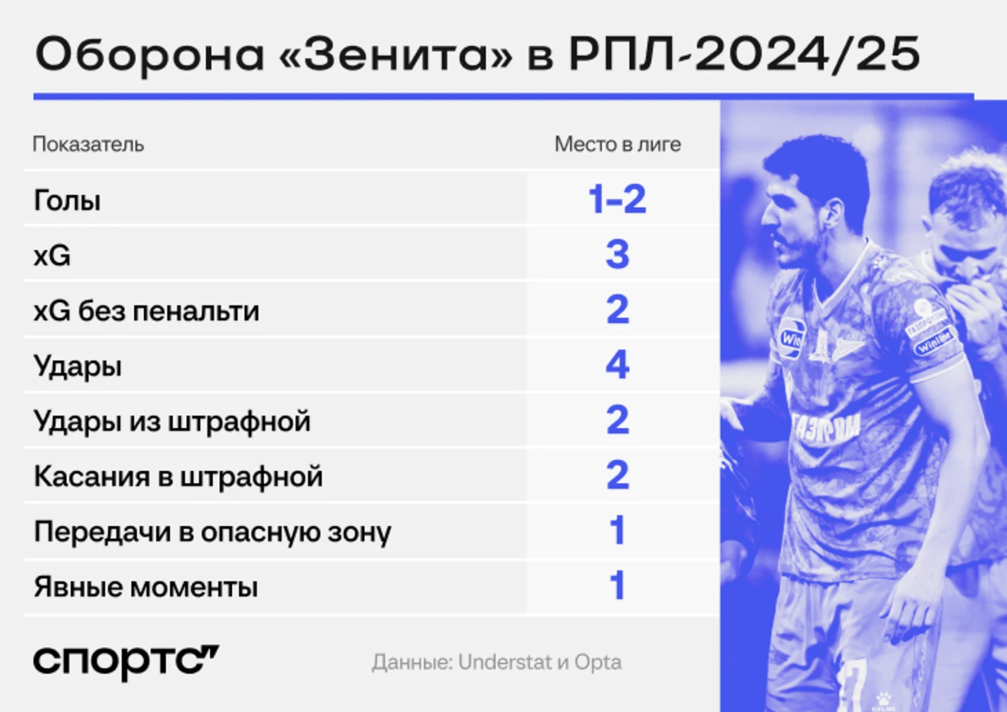 Оборона «Зенита» – одна из лучших в этом сезоне, но по многим продвинутым метрикам уступает соперникам. Например, у «Зенита» меньше всех пропущенных голов (столько же у «Краснодара») и допущенных явных моментов, но «Спартак» и ЦСКА превосходят по ожидаемым голам.