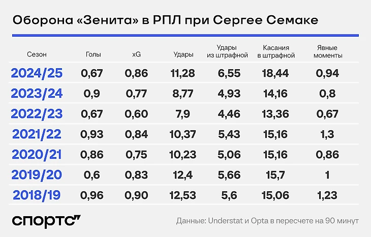Количество действий в своей штрафной достигло максимума за последние семь лет. По допущенным явным моментам нынешний результат сильно превосходят только поструинный-2018/19 и перестройка-2021/22, когда из-за ужасной формы Деяна Ловрена Семак ушел от 4-4-2 к 3-4-3.