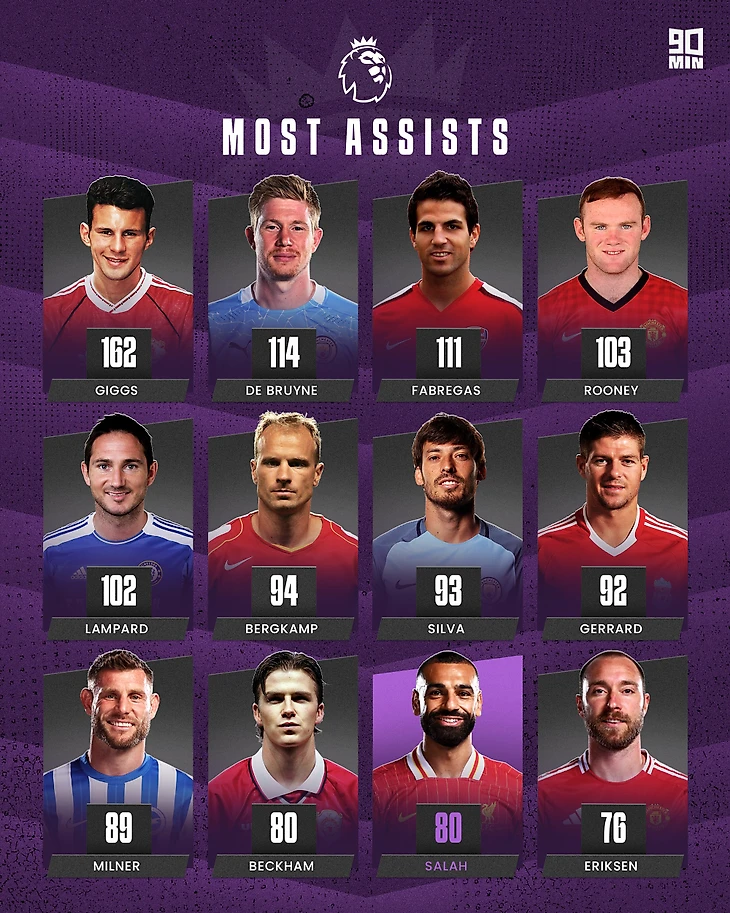 По ассистам Салах тоже может считаться одним из лучших в истории турнира. Фараон отдал 80 голевых передач в Премьер-лиге, по этому показателю он сравнялся с Дэвидом Бекхэмом – игроки делят десятую строчку в рейтинге лучших ассистентов в истории чемпионата.