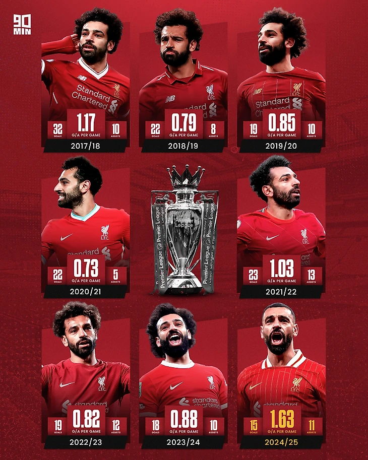 По результативным действиям за матч этот сезон для Салаха – лучший в составе «Ливерпуля». В среднем вингер мерсисайдцев совершает почти два результативных действия за игру в Премьер-лиге.