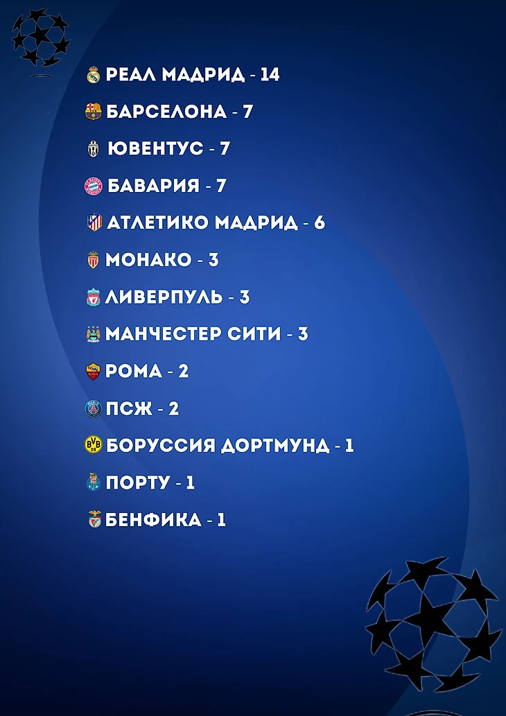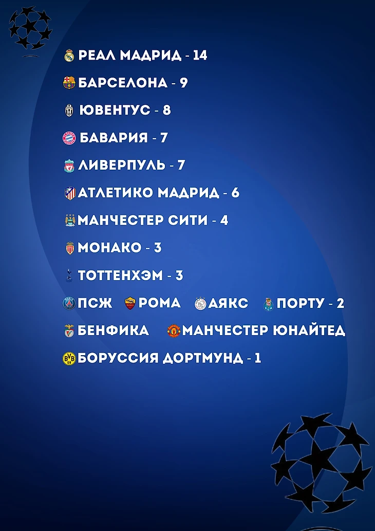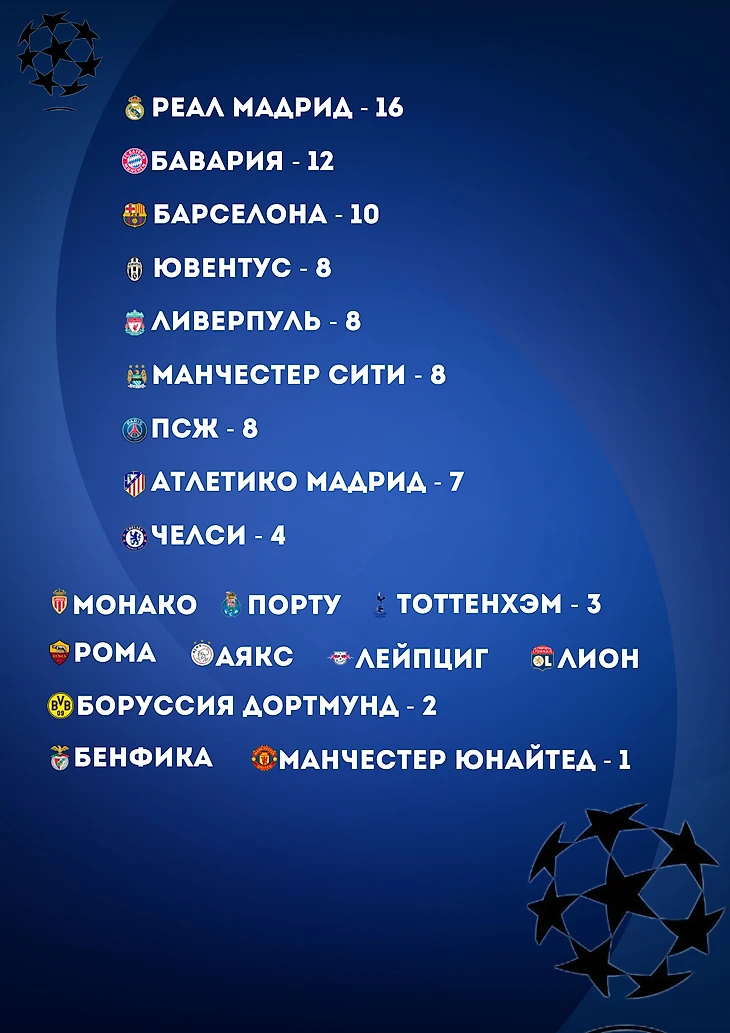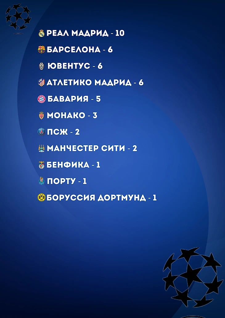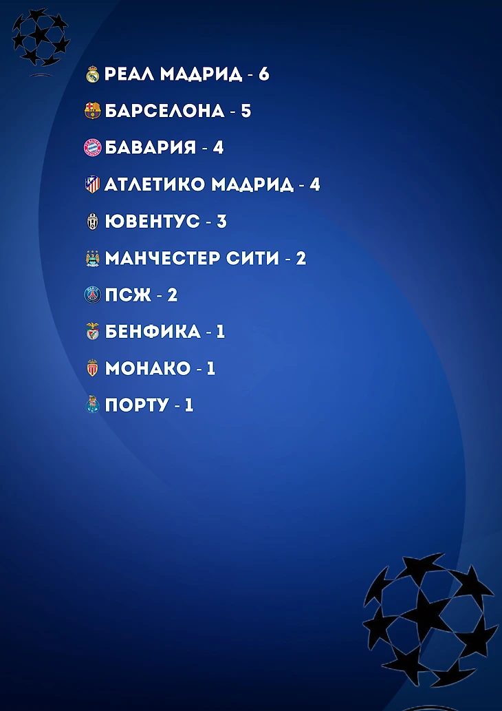 «Порту»«, Атлетико М», «Монако», «ПСЖ» - по 1-му баллу