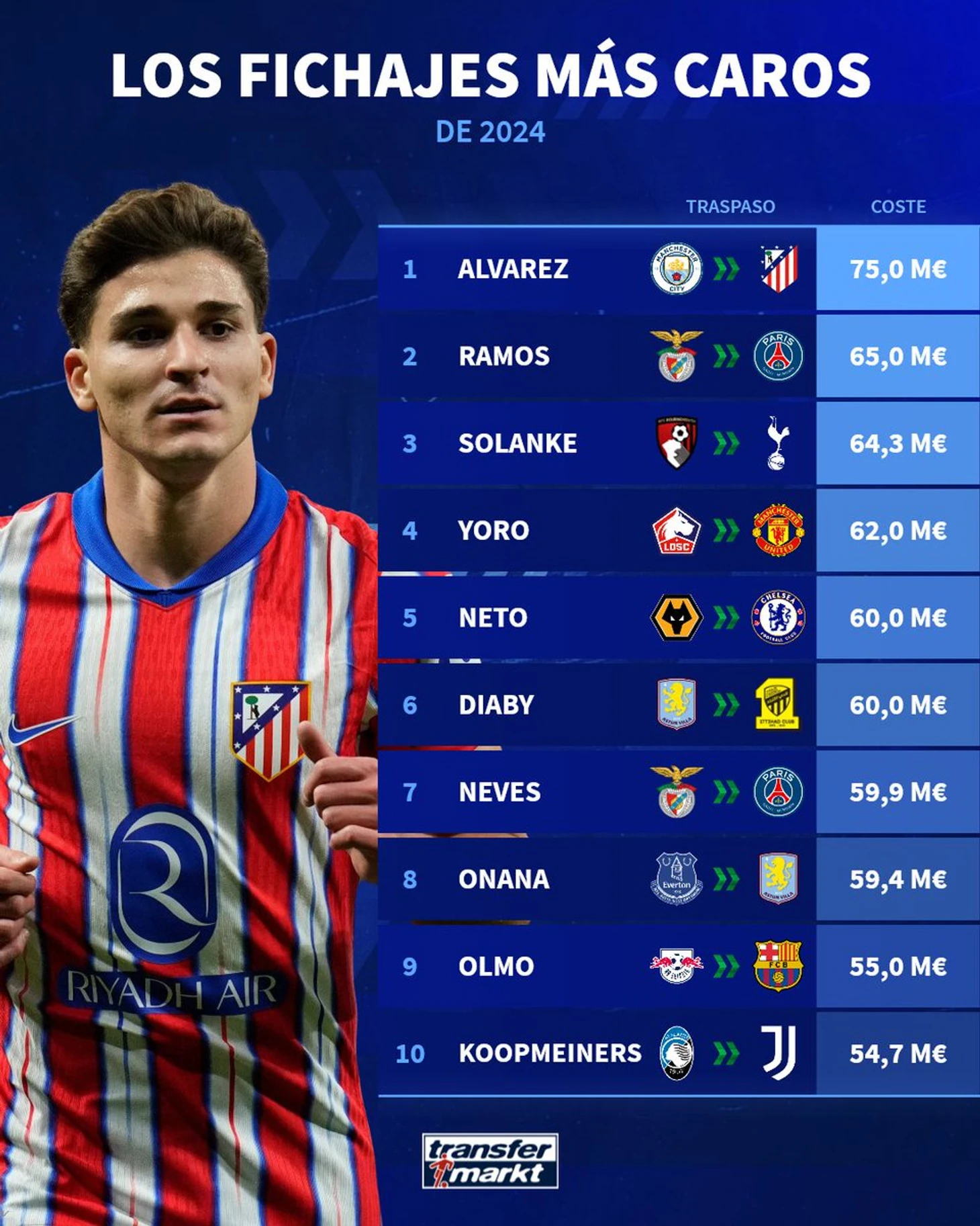 Топ-10 самых дорогих трансферов 2024 года. На первой строчке переход из АПЛ в Ла Лигу, в рейтинге есть сделка по Ольмо 🤑