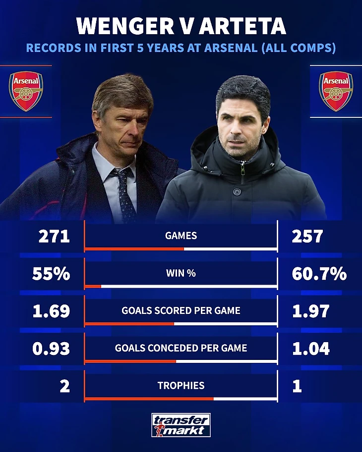 Tansfermarkt сравнил результаты «Арсенала» во всех турнирах за пять лет под руководством Артеты с показателями команды при Арсене Венгере за первые пять лет француза у руля «канониров».