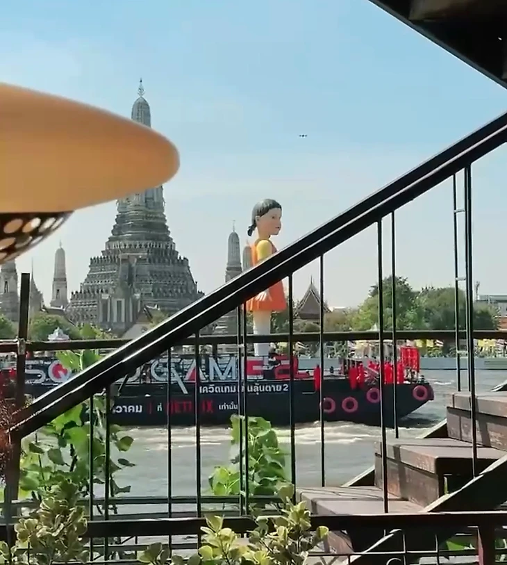 А это гигантская кукла Ен-Хи плывет по реке в Бангкоке. Ее сопровождали дроны, с них свисали реалистичные манекены.