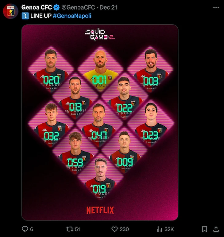 В Италии «Игру в кальмара» неожиданно рекламирует «Дженоа». Кажется, помог 45-й номер Марио Балотелли. В клубном видео номер итальянца превратился в 456-й. Это отсылка к числу участников смертоносной игры в первом сезоне.