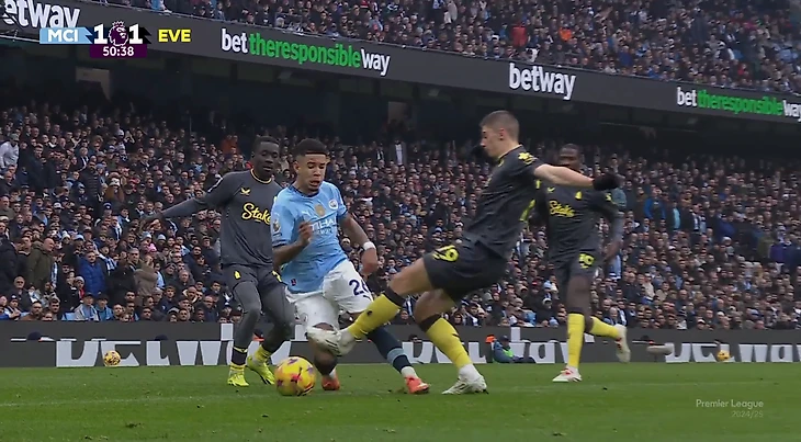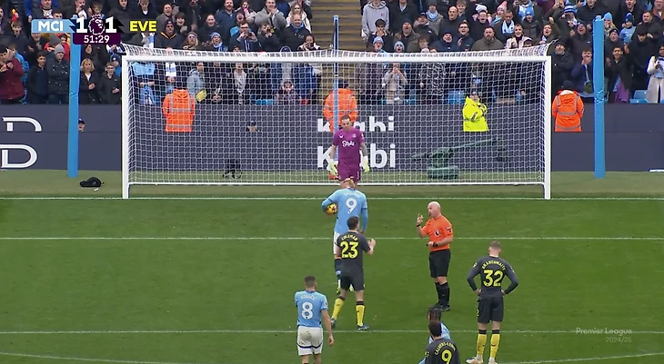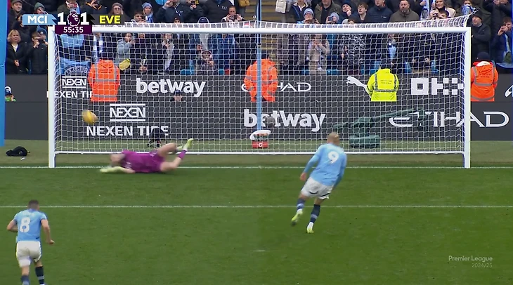 Работа проведена удачно. Трижды из последних пяти пенальти до этого удара Холанд бил влево от себя (правый для вратаря угол) – Пикфорд прыгнул туда же. В этом сезоне у Джордана вообще потрясающая статистика: ему били с точки два раза – он оба потащил. До Холанда в начале октября вратарь «Эвертона» отбил от Энтони Гордона из «Ньюкасла» (сыграли 0:0).
