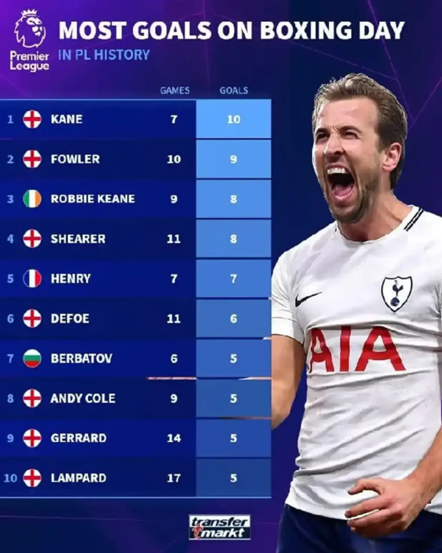 Лучшим бомбардиром АПЛ в Boxing Day остается Харри Кейн, у него 10 голов. Он единственный действующий игрок в топ-10.
