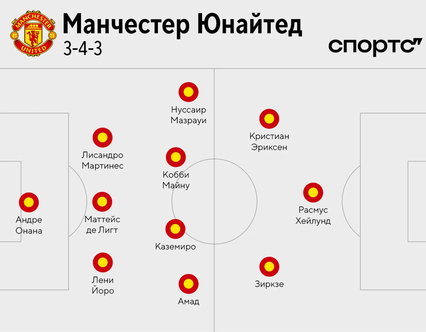 Дуэт Каземиро и Кобби Майну в центре полузащиты заменит недоступных Бруну и Угарте. Майну также может сыграть десяткой – тогда Эриксен опустится к Казе, но такая связка выглядит малоподвижной.