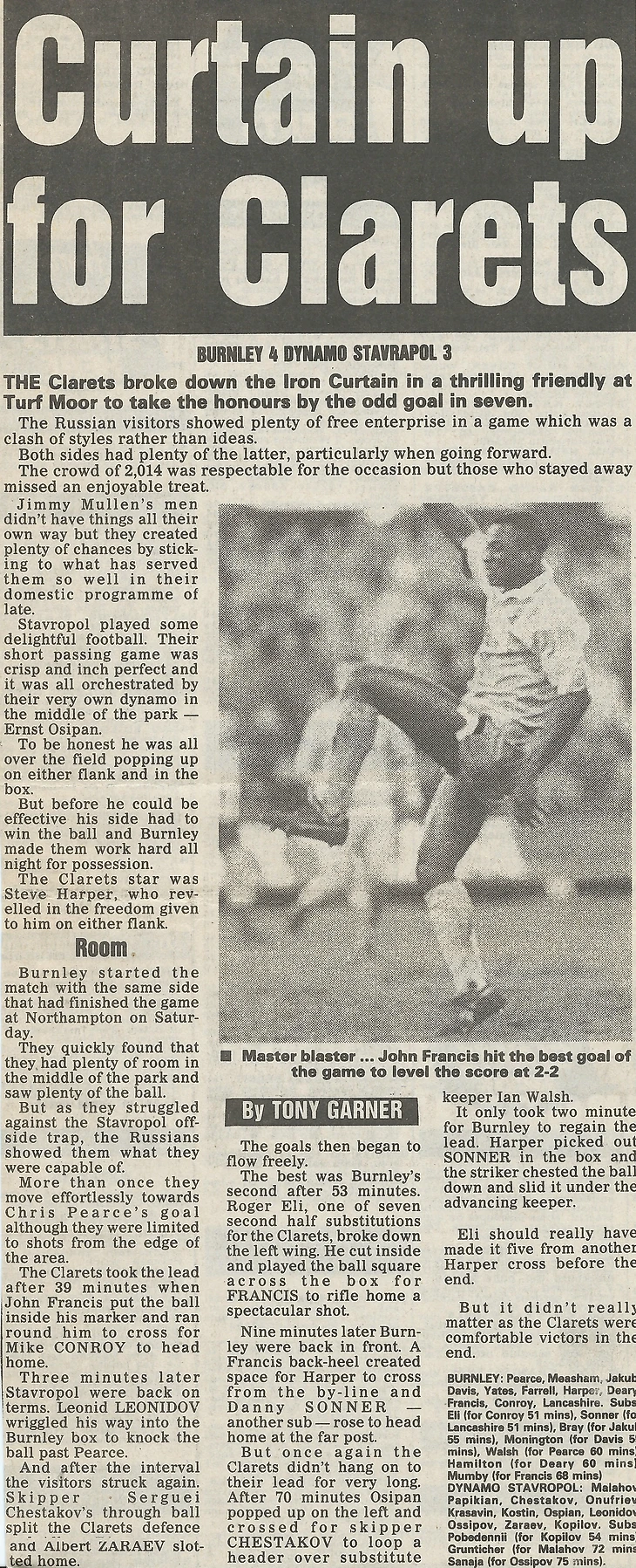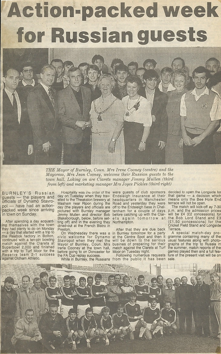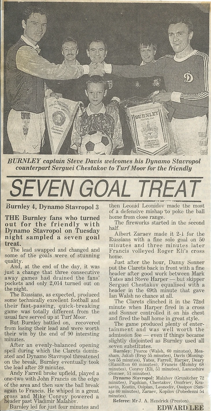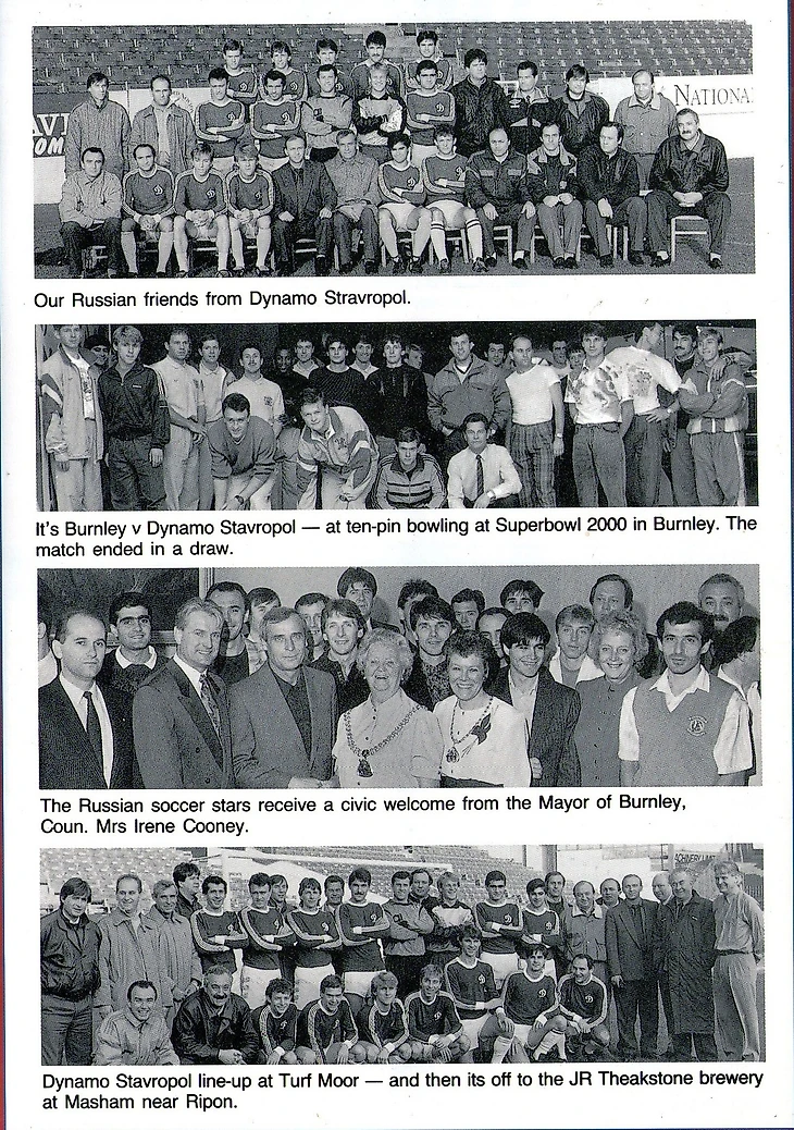 «Футбольный клуб «Бернли» подтвердил, что 26 ноября проведет товарищеский матч на «Терф Мур» против ставропольского «Динамо». Мы играли с ними в Советском Союзе в предсезонной подготовке, и тренер Джимми Маллен сказал, анонсируя игру: «Прошлые игры против русских научили наших игроков многому в континентальном стиле футбола. Эта игра предоставит нам еще один шанс учиться у первоклассной команды, и мы с нетерпением ждем встречи» [33].
