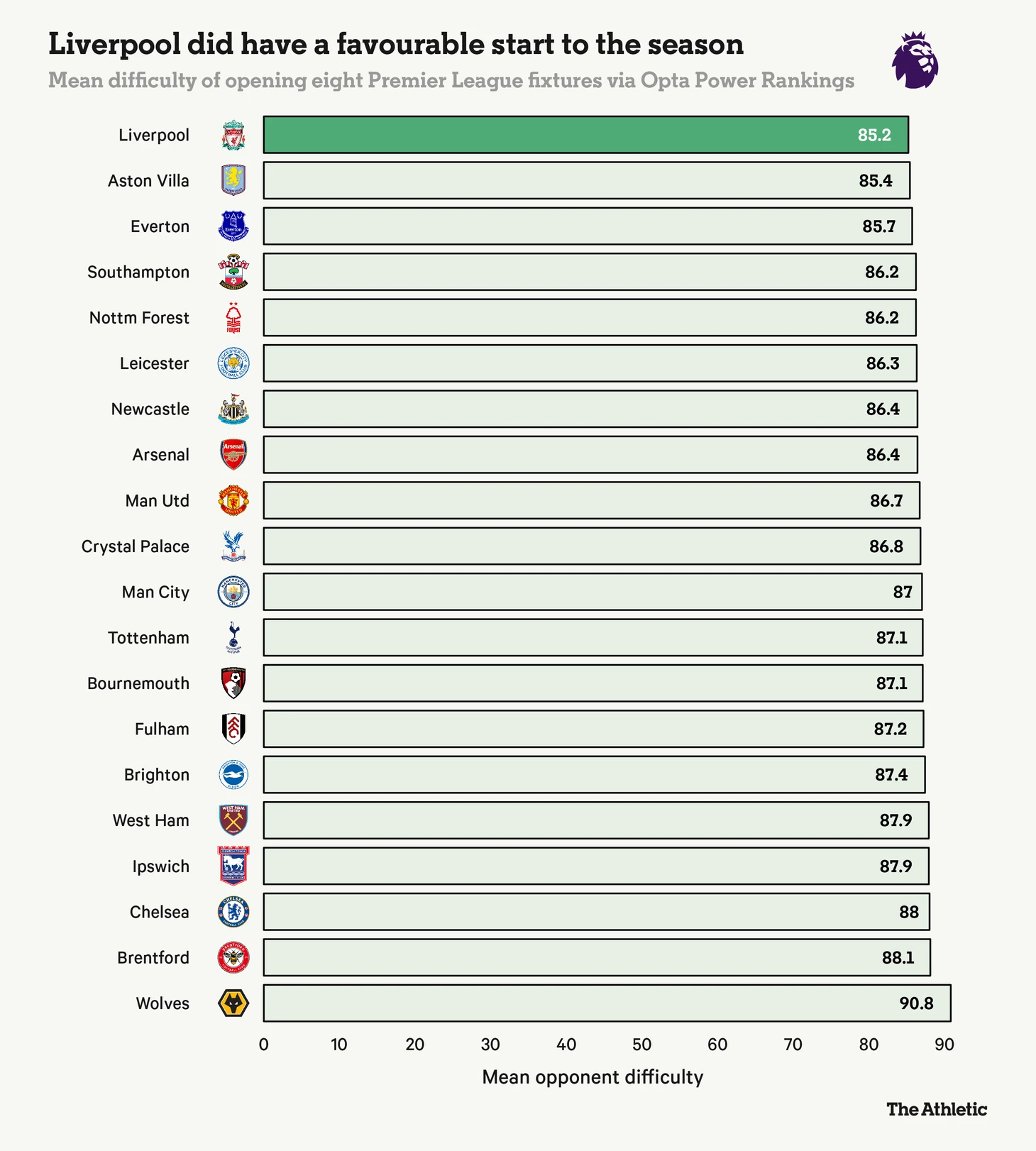 Используя Power Rankings компании Opta — глобальную рейтинговую систему, включающую более 13 000 клубов с рейтингом от нуля (самый низкий) до 100 (самый высокий) — для оценки силы соперников, «Ливерпуль» действительно имел статистически самый легкий старт в Премьер-лиге 2024/25 по итогам первых восьми матчей.