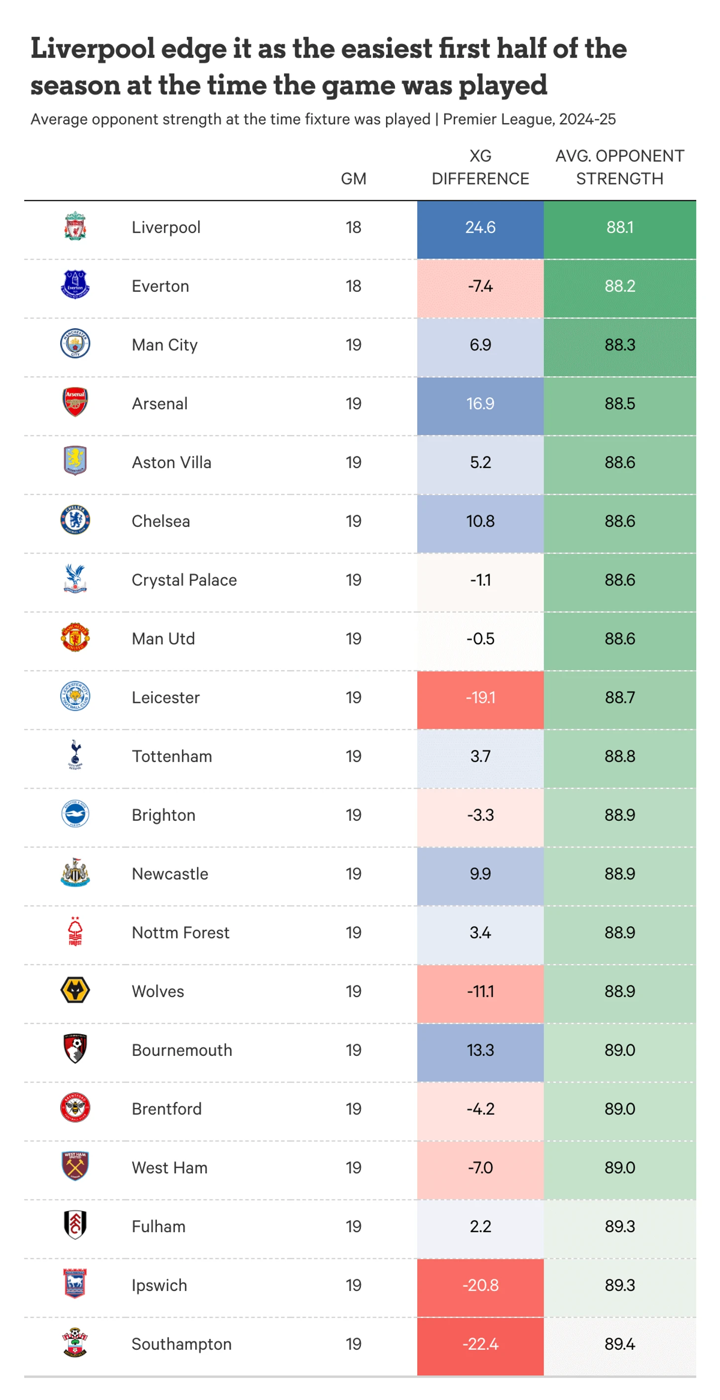 Возвращаясь к рейтингу Opta, мы можем скорректировать силу соперника с учетом времени проведения игры. Это не идеальная наука, но она позволяет нам выявить тонкие различия, которые могут существовать в расписании матчей каждой из сторон в первой половине сезона.