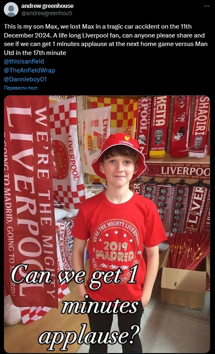 11 декабря 2024 года 17-летний фан «Ливерпуля» Макс Гринхаус погиб из-за автокатастрофы в городе Отони в Греции. Юноша находился на пассажирском сиденье в момент столкновения со зданием, когда авто слетело с дороги.