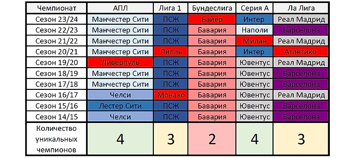 Несмотря на недавнее доминирование «Манчестер Сити», АПЛ в этом критерии впереди, разделяя первое место с Серией А, где аж 4 разных чемпиона за последние 5 лет. Вероятно, будет 5 за 6, если Гасперини совершит чудо и закончит сезон с «Аталантой» на первом месте. Худшая лига в данном компоненте — Бундеслига, с недавно закончившейся самой длинной серией чемпионств одной команды (11 раз подряд!).