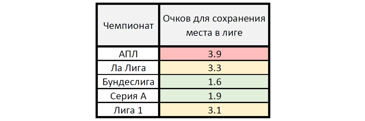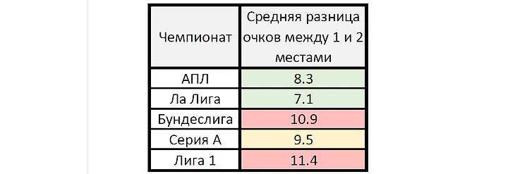Невооруженным глазом видно, что борьба за выживание в чемпионатах часто ожесточеннее, чем за чемпионство. По этому критерию Бундеслига и Серия А заметно интереснее других лиг, тогда как АПЛ, напротив, занимает последнее место.