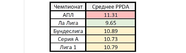 Еще один показатель зрелищности — интенсивность прессинга. Определяем по среднему PPDA (количество пасов на оборонительное действие). Чем этот показатель ниже, тем интенсивнее прессинг, соответственно, больше движа и интереснее смотреть футбол.