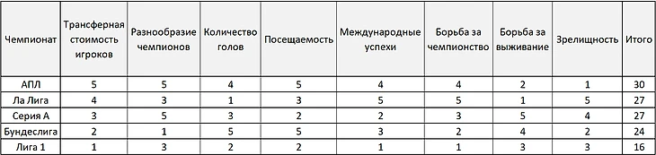 В совокупности по двум показателям Серия А заслуживает 5 очков, Бундеслига — 4, Лига 1 — 3, АПЛ — 2, а Ла Лига — лишь 1.
