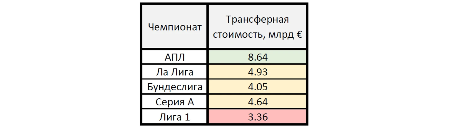 Лидер предсказуемо — АПЛ, забирает 5 баллов. Дальше — большая пропасть, после нее три лиги со средней стоимостью около 4 млрд евро, во главе с Ла Лигой, которая получает 4 балла. В конце списка — французская Лига 1 с одним баллом.
