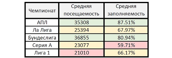 Два явных лидера и два явных аутсайдера. Поскольку Бундеслига впереди по посещаемости, а АПЛ — по заполняемости, обеим лигам дадим по 5 баллов, соответственно, и Лига 1, и Серия А получают по 2 балла.