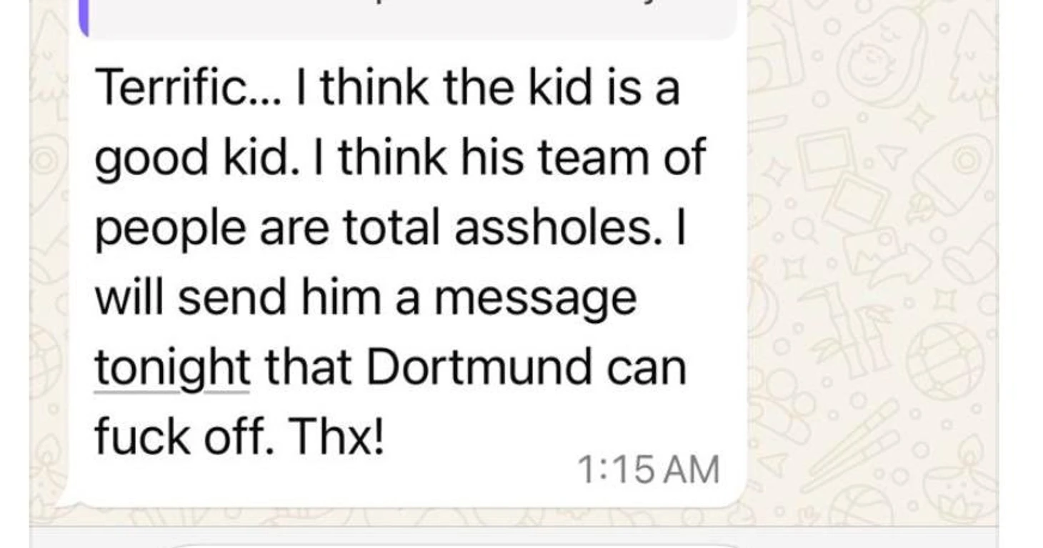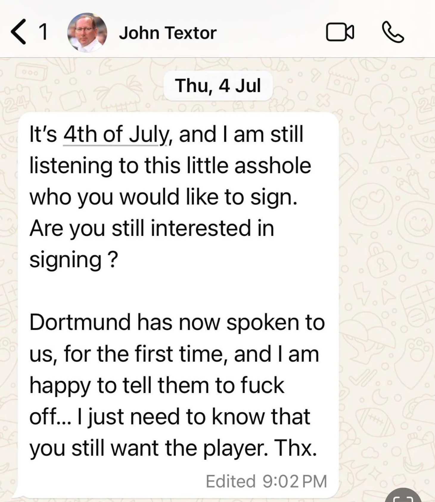 «Сегодня 4 июля, а я все еще слушаю этого маленького засранца, которого вы хотели бы подписать. Вы все еще заинтересованы в трансфере? «Дортмунд» впервые заговорил с нами, и я рад сказать им, чтобы они шли на###... Мне просто нужно знать, что вы все еще хотите подписать игрока. Спасибо».