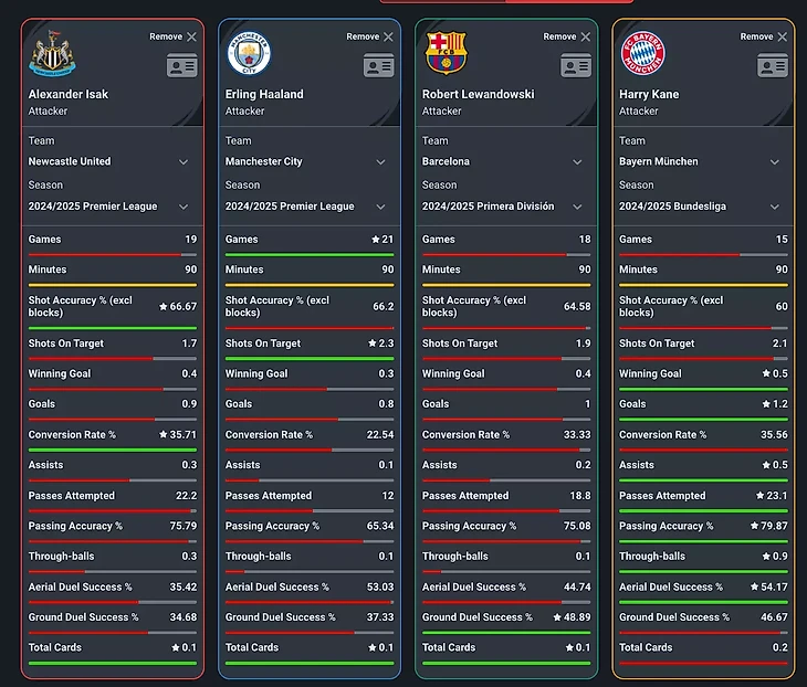 Норвежец также опережает Кейна, Левандовского и Исака по количество ударов в створ (2,3 на 90 минут), но норвежец отстает по всем остальным показателям, которые представлены в сравнительной матрице Squawka.