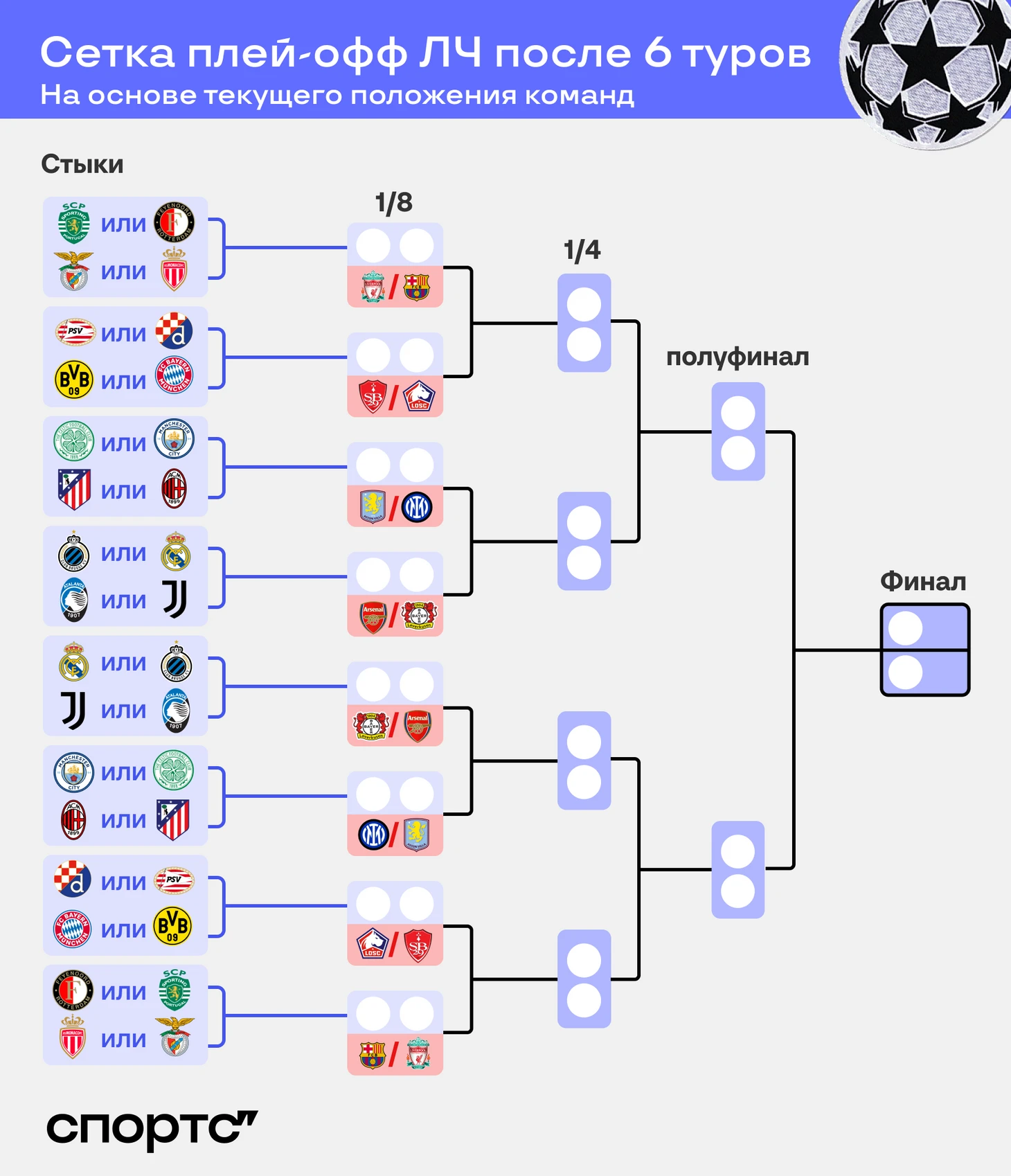 ● Восьмерка лучших поделена на связанные двойки: «Ливерпуль» – «Барселона», «Арсенал» – «Байер», «Астон Вилла» – «Интер», «Брест» – «Лилль».