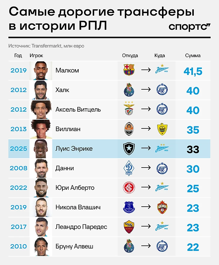 Энрике – в топ-5 самых дорогих трансферов РПЛ. Там сплошной «Зенит»