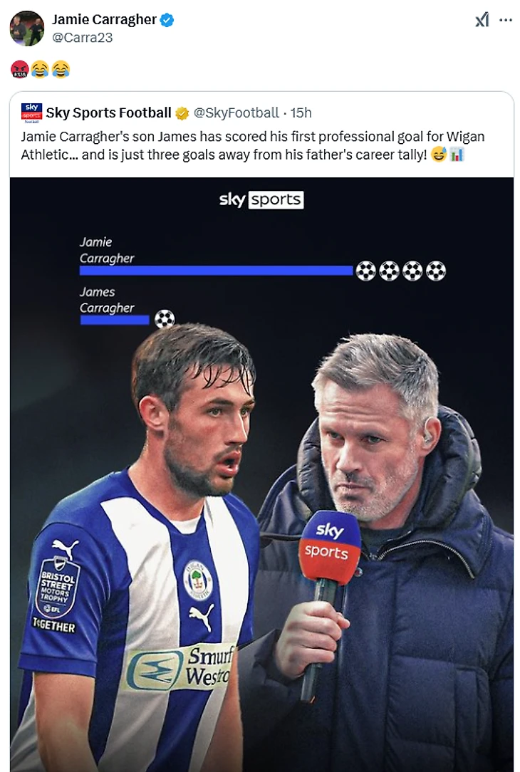 Sky Sports нашел повод потроллить легенду «Ливерпуля»: «Джеймс, сын Джейми Каррагера, забил первый гол в профессиональной карьере. Это значит, что он всего в трех голах от результата отца за всю карьеру».