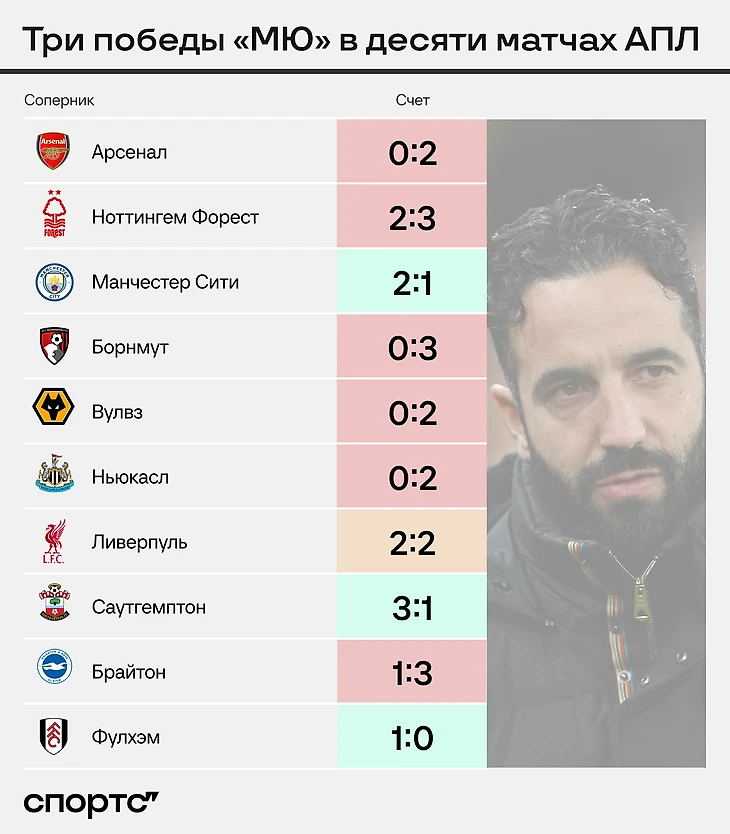 Аморим снова выставил редкую, но любимую связку в центре поля: уже четвертый раз победили с Бруну Фернандешем и Мануэлем Угарте. Проиграли только «Арсеналу» – 0:2 на «Эмирейтс». Но выглядели тогда неплохо.