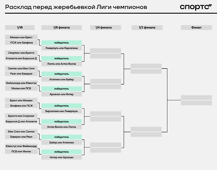 ● В 1/16 финала точно будет французская пара: «ПСЖ» сыграет либо с «Монако», либо с «Брестом». С кем-то из французов пересечется «Бенфика». «ПСЖ» может рубиться с «Ливерпулем» или «Барселоной» уже в 1/8 финала.