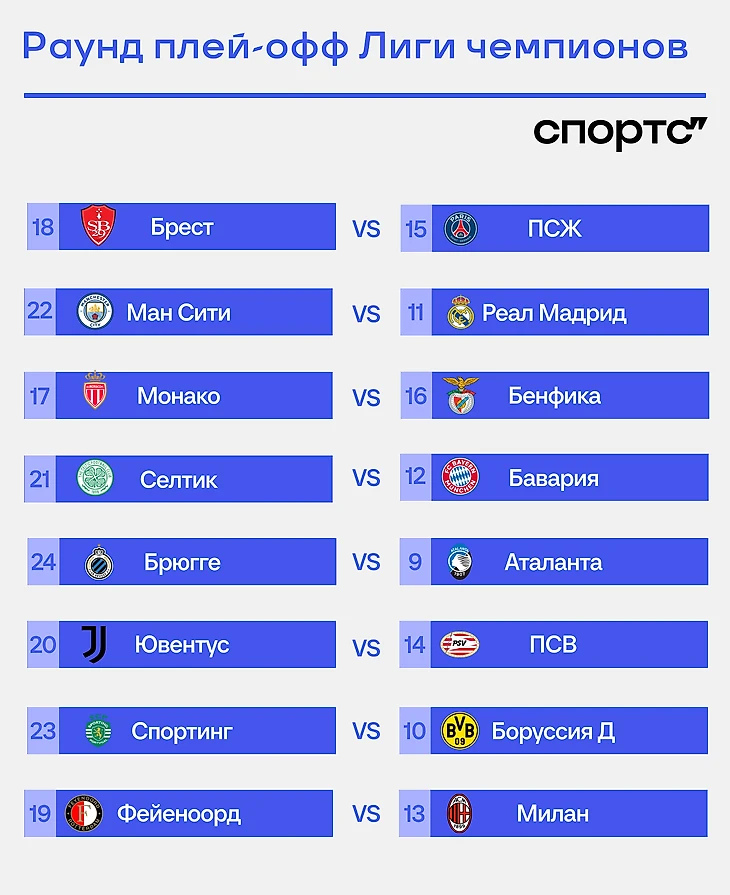 Первые матчи раунда плей-офф пройдут 11-12 февраля, ответные – 18-19 февраля. А уже 21 февраля мы узнаем и пары на 1/8 финала, и всю сетку до самого финала.