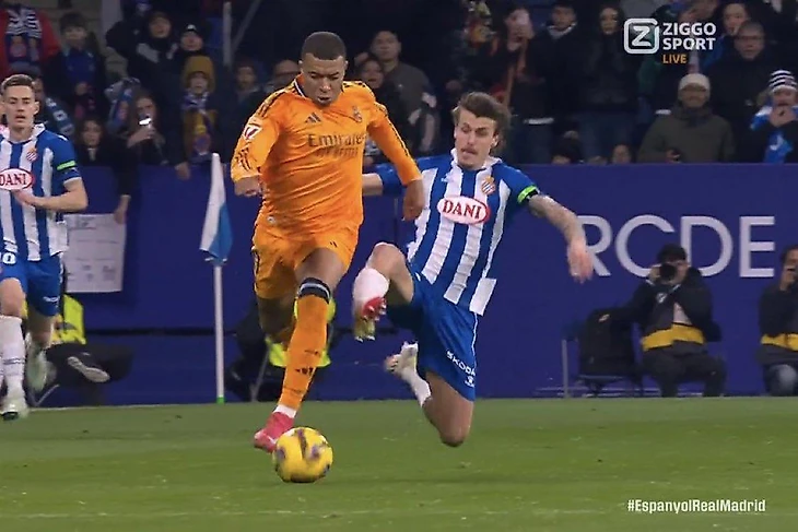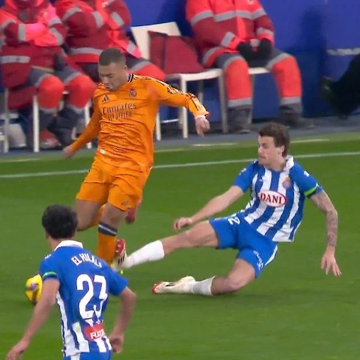 Игрок «Эспаньола» чуть не оторвал ногу Мбаппе, но избежал удаления. А потом забил победный «Реалу»!